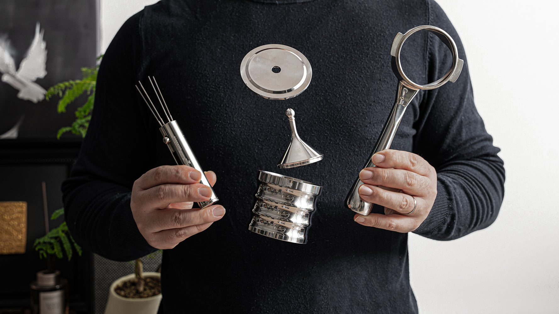 The COD Espresso Portafilter can sit flat at 180°, allowing you to do WDT, Distribution, and Tamping directly on the table.