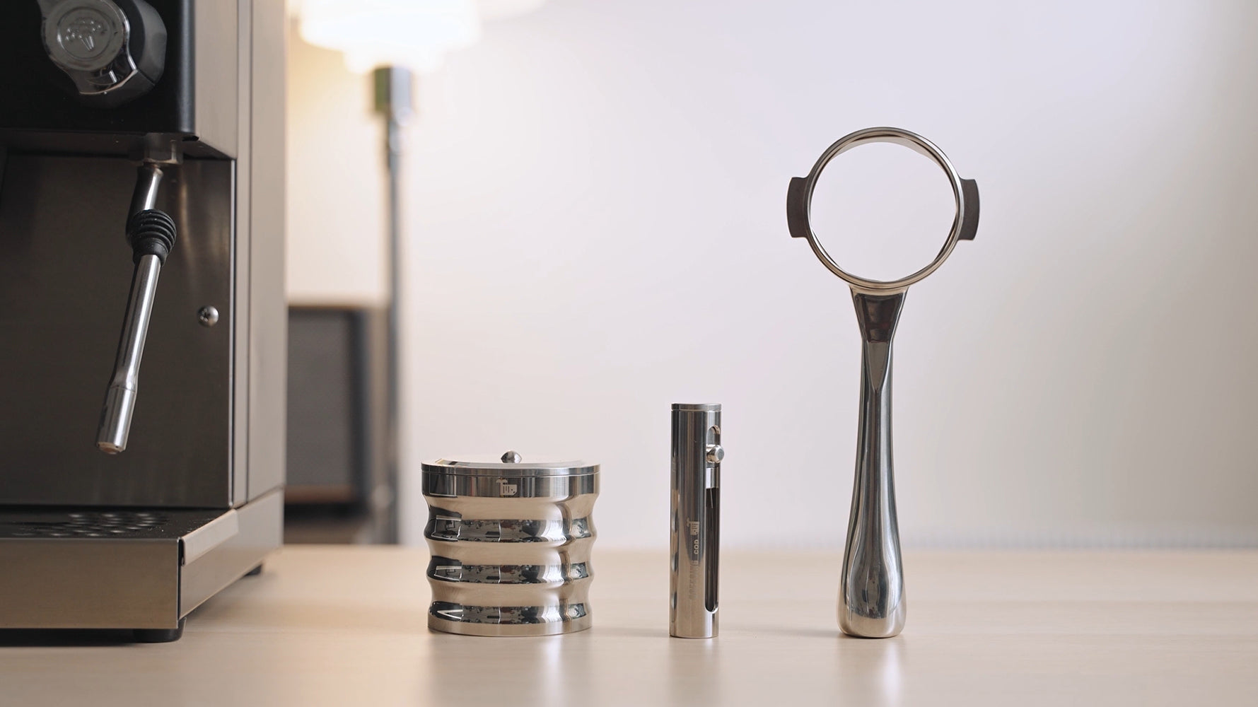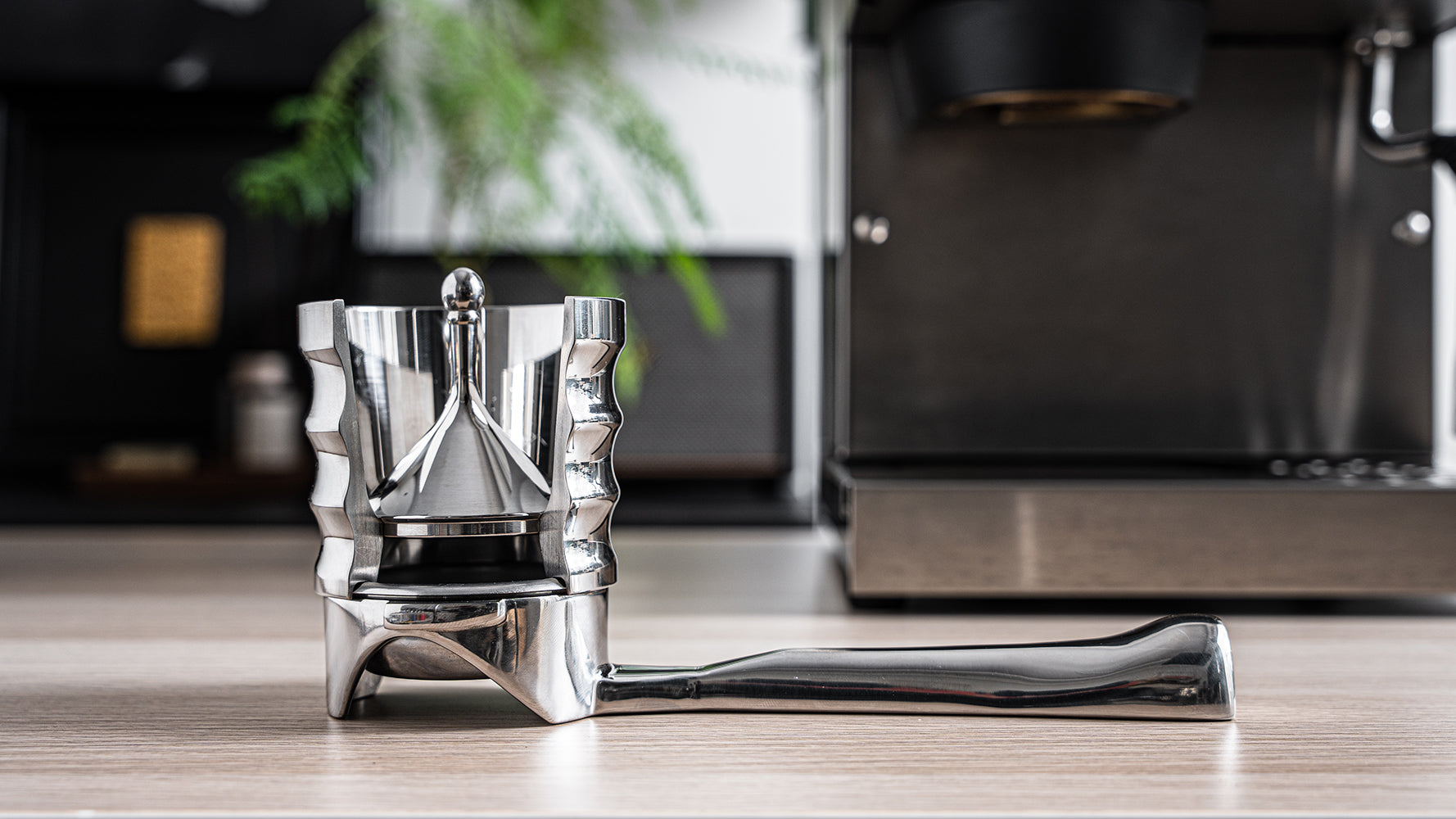 Polished stainless steel inside and outside for a smooth surface so coffee powder falls cleanly; the outer wall has a finger groove for a comfortable grip.